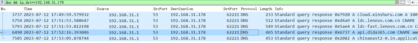 api.dida365.com的 DNS 请求被加密成 HTTPS,在 dns 筛选中不显示。除此之外所有的 DNS 请求都走 119.29.29.29,比如随后响应的