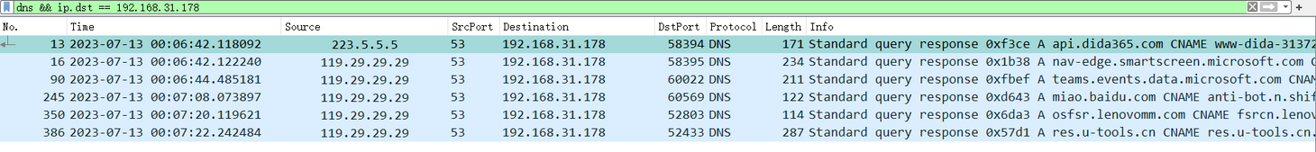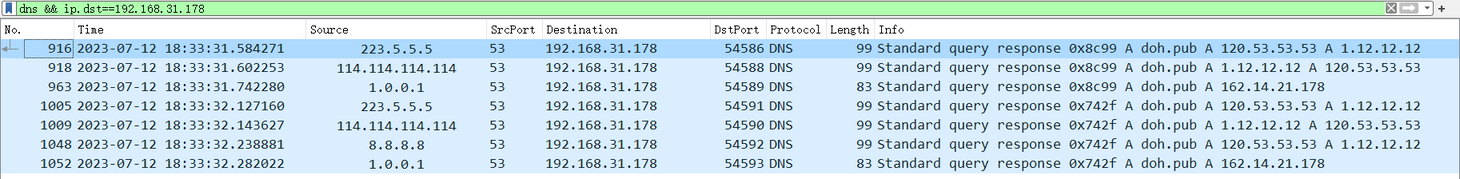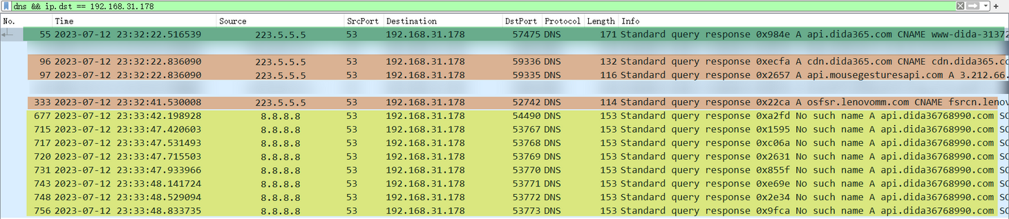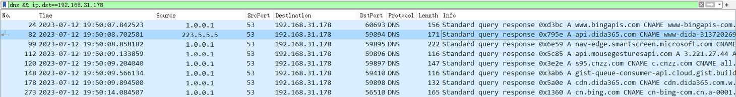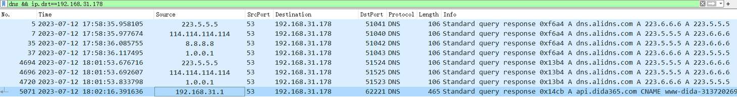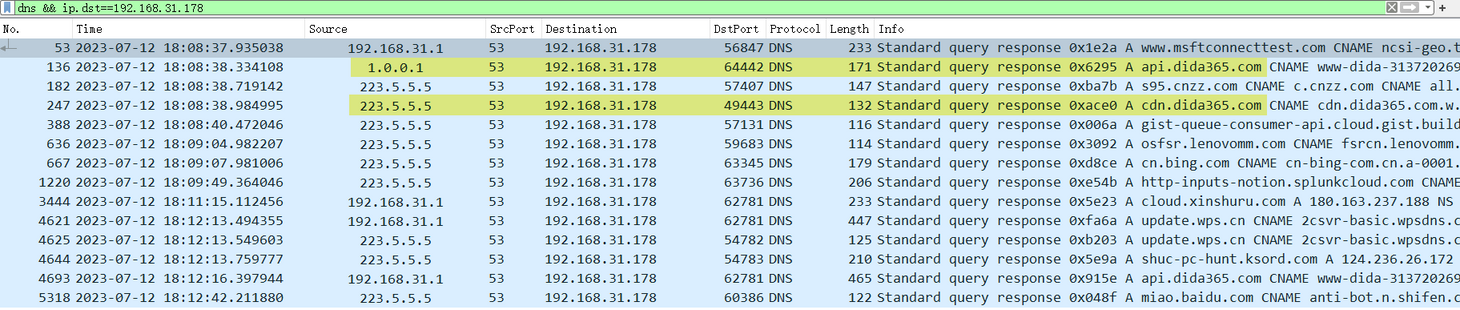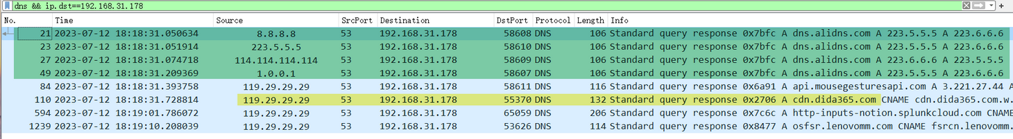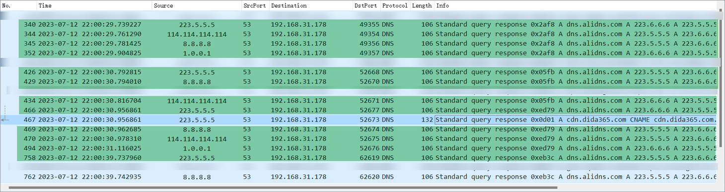 dns && ip.src==223.5.5.5)怎么会有来自本地运营商发来的 DNS 查询响应呢?这涉及到 Windows 操作系统级的 DNS 查询组策略,我们后文细说。