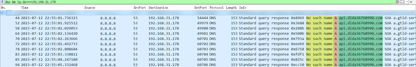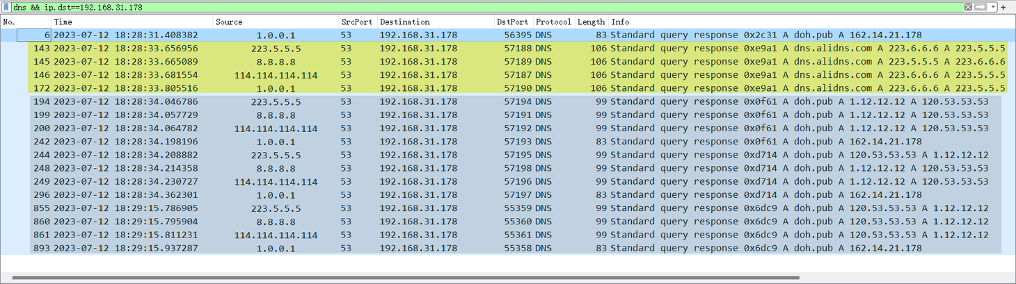 当我们等待一段时间后,我们可以陆续收到来自系统DNS(网关)返回的 DNS 查询响应。按理说,我们的请求不是被加密了吗?要响应也应该是 HTTPS 类型的协议,再不济也应该是阿里服务器返回的响应啊?(也即