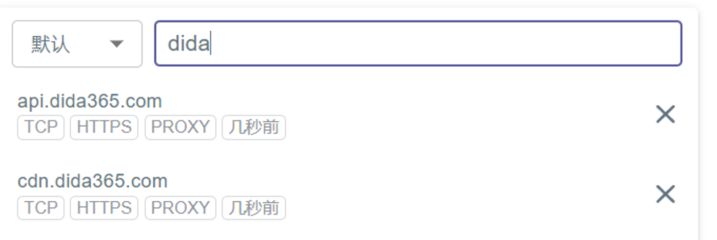 api.dida365.com的 DNS 请求被加密成 HTTPS,在 dns 筛选中不显示。其他的 DNS 请求都走 nameserver ,也即默认值