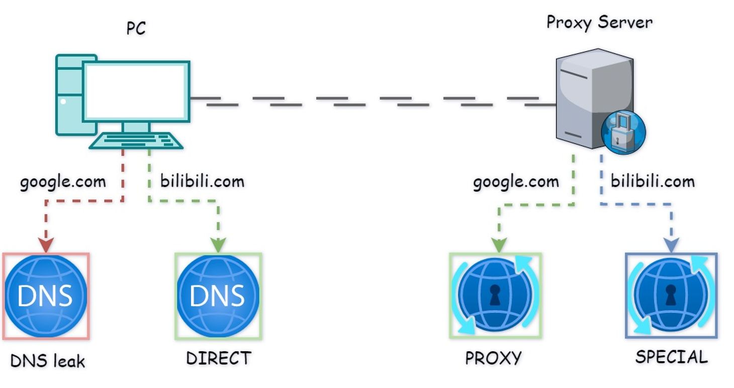 广义上讲,访问应该被代理的网站的 DNS 请求必须由落地代理产生,而真正的发送端被隐藏起来。如果你认为只要访问被代理的网站时,本地发起了 DNS 请求就算泄漏的话,这种情况属于 DNS 泄漏,你的配置不正常。