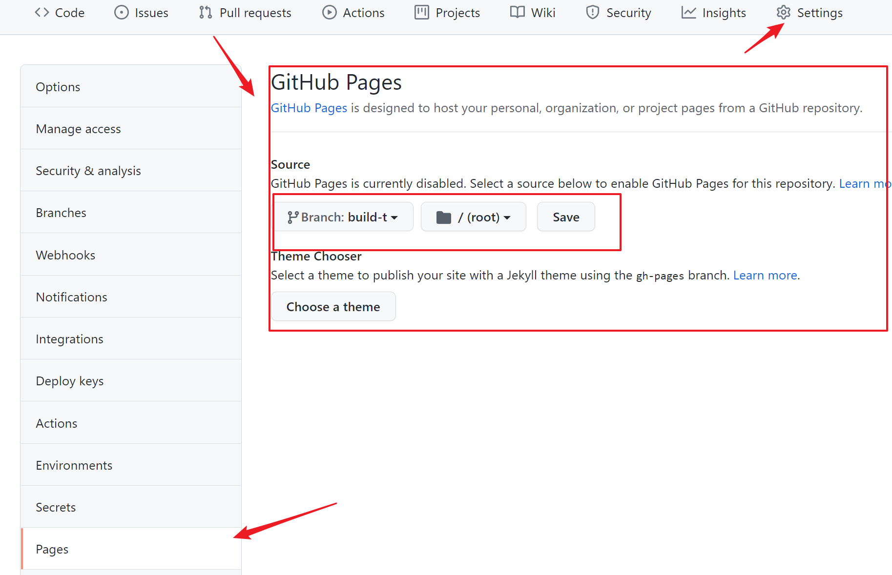 Settings – Pages ,指定 Source,Branch 就是你指定的分支,路径选择