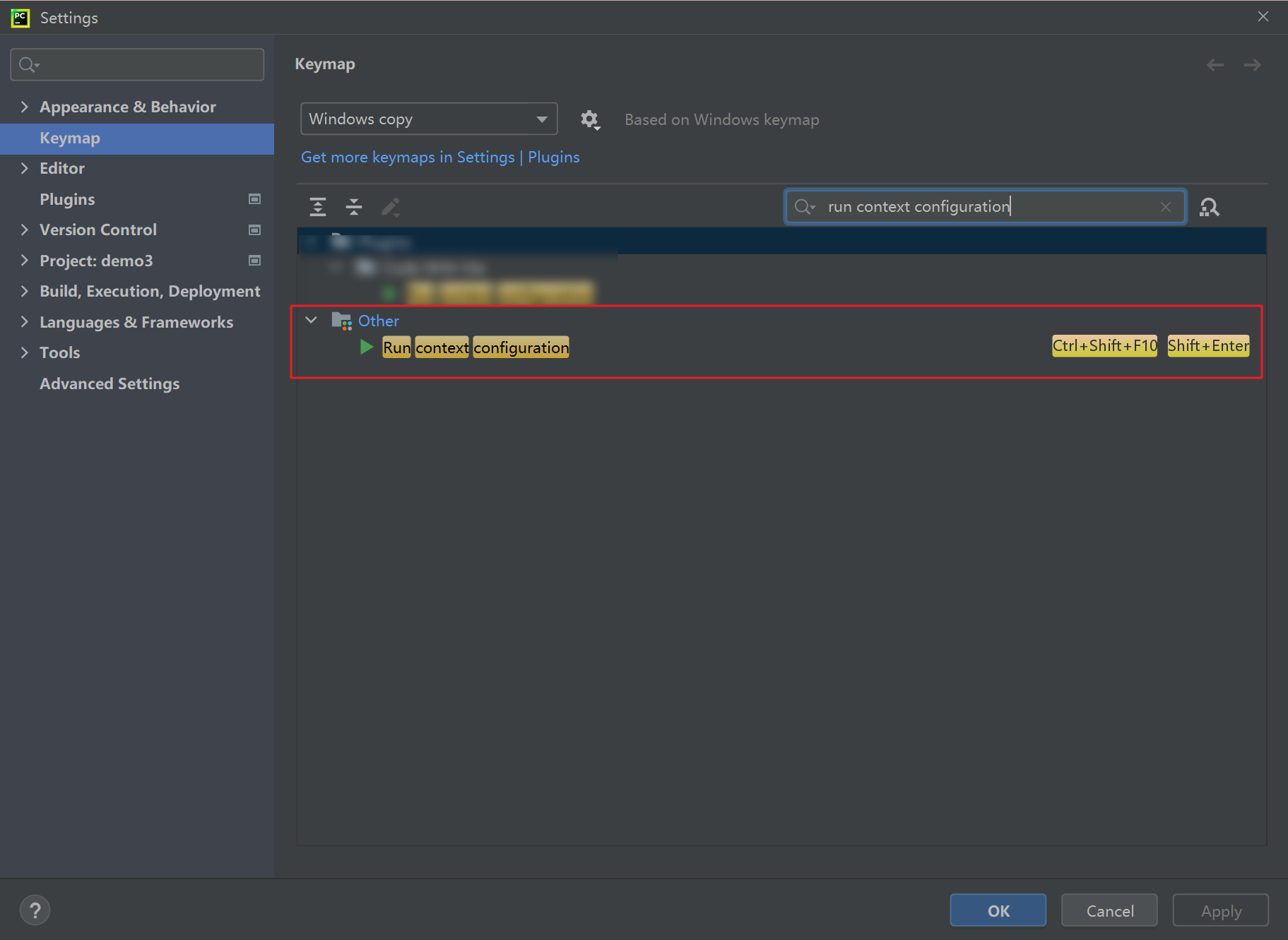 在「文件(File)」→「设置(Settings)」→「键盘映射(Keymap)」中搜索「run context configuration」,并将下图所示的 「运行(Run context configuration)」快捷键添加一个 Shift + Enter 触发方式。此时会显示快捷键冲突,可以无视,因为这些功能几乎不会用到。