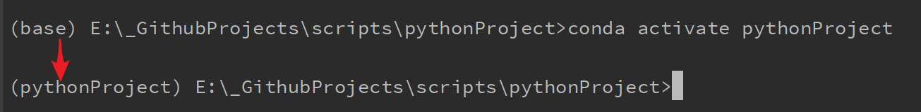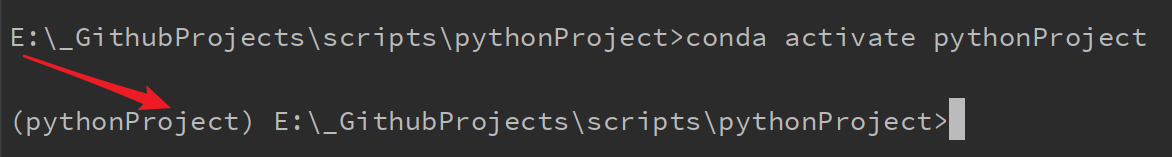 conda activate [envName],也即当前的开发环境名为「pythonProject」,运行指令conda activate pythonProject切换虚拟环境: