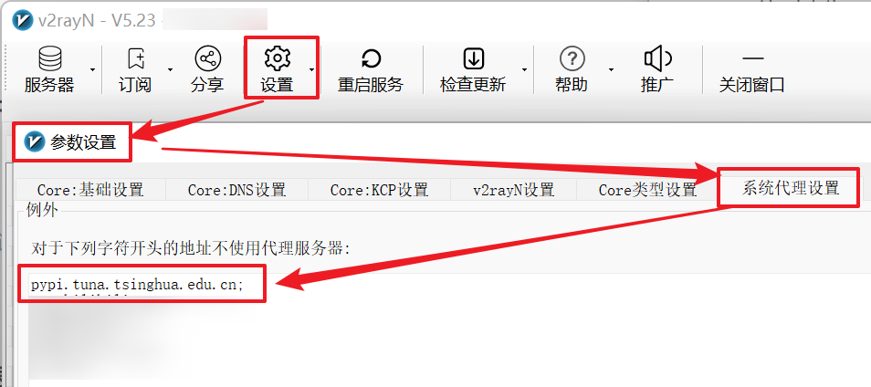启动代理客户端,依次打开 设置 → 参数设置 → 系统代理设置,在「例外」中填入镜像域名,以清华源 pip 镜像域名为例,填入
